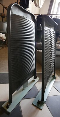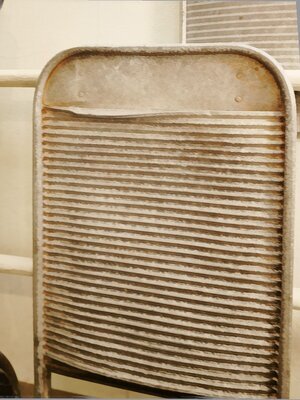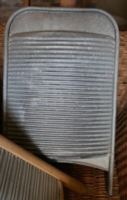 Fünf fast identische Wachbretter. Aus komplett verzinktem Stahlblech hergestellt, im Vollbad hellglänzend verzinkt mit gewölbtem Riffelbrett. Vergleichbar mit den AEWA-Waschbrettern.
