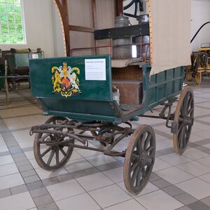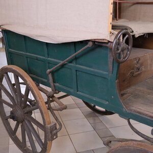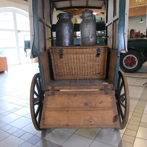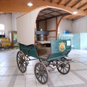 Bei unserer grün lackierten Pferdekutsche, handelt es sich um eine kleines, 2 Achsiges Gefährt, das in ländlichen Gebieten als Allzweckfahrzeug diente. Mit ihr wurden z. Bsp. Milchkannen zur Molkerei oder auch Personen auf Notsitzen befördert. Gegen Witterungseinflüsse sind Kutscher, Ware und Personen durch ein Textilverdeck geschützt, das auf der Rückseite geöffnet werden kann. Die Kutsche wurde als Einspänner gefahren. Neben dem Kutscher hatte noch 1 Personen Platz. Im Laderaum konnte ein Notsitz eingebaut werden. Für ein komfortableres fahren, hat der Hersteller aus Luxemburg (Name unbekannt), zwischen Chassis und Fahrgestell 4 Blattfedern eingebaut. Die heftigsten Unebenheiten der Straße wurden so abgemildert. Bremsen konnte der Kutscher mit einem Drehrad (siehe Bild). Die fein dosierbare Bremse wirke über ein Gestänge auf beide Hinterräder, in dem ein Holzklotz gegen die beiden Radreifen gedrückt wurde. Daher auch der Name Klotzbremse. Ob ursprünglich eine Beleuchtung vorgesehen war, oder sie im Laufe der Zeit abgebaut wurde, lässt sich nicht mehr feststellen.