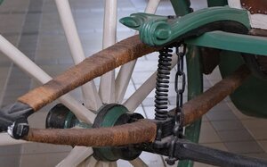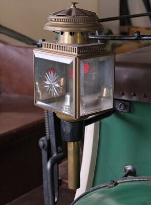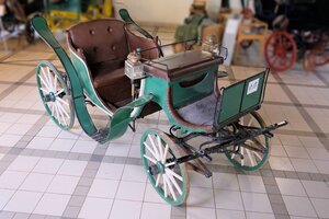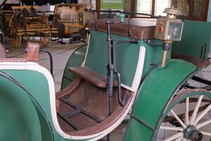 Diese Reisekutsche ist an den Typ "Mylord" angelehnt, hat jedoch kein Verdeck. Gebaut wurde sie in den 1920er Jahren. Auf den Abdeckungen der Radnaben ist vermutlich der Hersteller eingestanzt, aber leider nicht mehr identifizierbar. Erkennbar sind nur noch Fragmente einer Kyrillische Schrift. Die hochwertig gearbeitete Sitzbank, aus braunem Leder mit Knopfpolsterung, bietet Platz für 2 Personen. Gegenüberliegend ist eine einfache, schmale Sitzbank (Notsitz), für einen zusätzlichen Mitfahrer eingebaut. Ihm obliegt es die Bremse zu bedienen, deren Kurbel direkt neben dem Notsitz angebracht ist. (s. Bild) Die Bremse wirkt auf beide Hinterräder, in dem zwei Holzklötze über ein Gestänge gegen das Vollgummi der Hinterräder gedrückt werden. Auffällig, ist der schwungvoll gearbeitete Kotflügel. Zwischen Vorder- und Hinterrad, weit nach unten gezogen, dient er gleichzeitig als Einstiegshilfe. Während die Vorderräder mit Eisenreifen ausgestattet sind, laufen die Hinterräder auf Gummiprofilen. Ob die Bereifung in dieser Kombination dem Original entspricht, konnten wir nicht feststellen. Für eine angenehme Fahrt sorgen 4 Blattfedern, die das Fahrgestell mit dem Aufbau verbinden. Interessant ist ein Detail an der Hinterachse. Vermutlich zur Schwingungsdämpfung, wurde zwischen die Blattfedern eine unterstützende Feder und eine kurze Kette eingebaut (s. Bild). Die beiden Öllampen, rechts und links vom Kutschersitz, dienen als Beleuchtung. Das Glas ist geschliffen, was für eine gute Sichtbarkeit sorgte. Auf der Lampenrückseite ist eine Öffnung, die mit rotem Glas verschlossen ist. Eine Art Rücklicht.