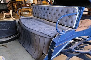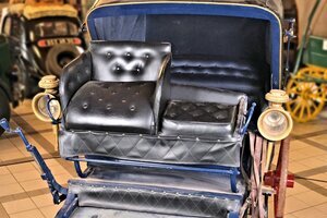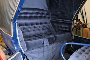 Bei unsere Kutsche könnte es sich um eine modifizierte Form vom Typ Victoria handeln. Die Farbe von Fahrgestell und dem Sitzbereich ist blau. Ebenso der Himmel des hochklappbaren Faltverdecks. Die vier großen Speichräder sind Eisenbereift und in rot lackiert. Ein komfortabler Zustieg wurde durch die niedrig angeordneten Türen, sowie einer Einstiegshilfe sichergestellt. Die Sitzbank der Herrschaft wurde aus samtähnlichem, blauem Stoff, mit Knopfpolsterung hergestellt. Direkt gegenüber, allerdings nicht mehr unter dem Dach, ist eine weitere Sitzbank eingebaut. Bezogen mit dem gleichen hochwertigem Stoff und seitlichen Lehnen. (S. Bild) Der Kutschbock hat ebenfalls Ledersitze mit Knopfpolsterung. Ein sicheres Indiz dafür, dass diese Kutsche als „Selbstfahrer“ genutzt wurde (d.h. der Hausherr oder der Dame fahren selbst). Die rechts vom Kutschersitz angebrachte Kurbelbremse lässt sich sehr gut dosieren. Über ein Gestänge werden die hölzernen Bremsklötze direkt auf die Lauffläche der Räder gedrückt. Daher auch die Bezeichnung Klotzbremse Das Fahrgestell ist traditionelle Schmiedearbeit. Fahrgestell und Aufbau sind durch 4 Blattfedern miteinander verbunden, was eine angenehmere Reise verspricht. Die Kutschenbeleuchtung besteht aus zwei Öllampen mit geschliffenen Gläsern.