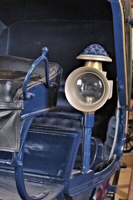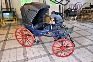 Bei unsere Kutsche könnte es sich um eine modifizierte Form vom Typ Victoria handeln. Die Farbe von Fahrgestell und dem Sitzbereich ist blau. Ebenso der Himmel des hochklappbaren Faltverdecks. Die vier großen Speichräder sind Eisenbereift und in rot lackiert. Ein komfortabler Zustieg wurde durch die niedrig angeordneten Türen, sowie einer Einstiegshilfe sichergestellt. Die Sitzbank der Herrschaft wurde aus samtähnlichem, blauem Stoff, mit Knopfpolsterung hergestellt. Direkt gegenüber, allerdings nicht mehr unter dem Dach, ist eine weitere Sitzbank eingebaut. Bezogen mit dem gleichen hochwertigem Stoff und seitlichen Lehnen. (S. Bild) Der Kutschbock hat ebenfalls Ledersitze mit Knopfpolsterung. Ein sicheres Indiz dafür, dass diese Kutsche als „Selbstfahrer“ genutzt wurde (d.h. der Hausherr oder der Dame fahren selbst). Die rechts vom Kutschersitz angebrachte Kurbelbremse lässt sich sehr gut dosieren. Über ein Gestänge werden die hölzernen Bremsklötze direkt auf die Lauffläche der Räder gedrückt. Daher auch die Bezeichnung Klotzbremse Das Fahrgestell ist traditionelle Schmiedearbeit. Fahrgestell und Aufbau sind durch 4 Blattfedern miteinander verbunden, was eine angenehmere Reise verspricht. Die Kutschenbeleuchtung besteht aus zwei Öllampen mit geschliffenen Gläsern.