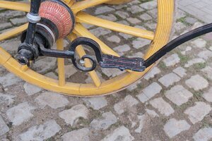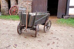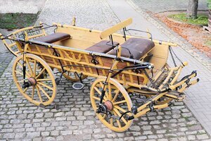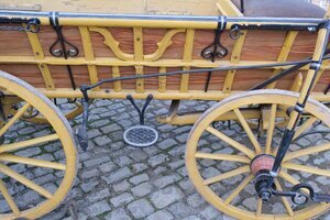 Dieser Pferdewagen stammt ursprünglich aus der Kutschensammlung „Kaurisch“ in Trier. Soweit wir wissen, wurde er in Ungarn gebaut, wofür es am Wagen selbst keine Hinweise gibt. Der Leiterwagen wurde mit Sicherheit nicht für den groben Transportbetrieb eingesetzt. Denn es befinden sich ringsum verzierte, schwarz lackierte Metallbeschläge und auch die verzierte, hölzerne Seitenwand sprechen dagegen. Gefahren wurde der Leiterwagen als Zweispänner. Das erforderliche Geschirr ist komplett vorhanden. Der Leiterwagen verfügt über herausnehmbare Sitzbänke, die für den Personentransport gebraucht wurden. Für den leichteren Zustieg, der über die seitliche Bordwand erfolgte, gibt es auf beiden Seiten Einstiegshilfe. (s. Bild) Da der Leiterwagen keine Federung besitzt, war die Fahrt für die Gäste eine holprige Angelegenheit. Ausgenommen ist der Sitzplatz des Kutschers. Seine Sitzbank war dick gepoltert und mit Leder bezogen. Außerdem ist die Sitzbank, samt Lehne, über zwei Blattfedern mit dem Wagen verbunden, die alle harten Stöße absorbiert. Die rechts vom Kutschersitz angebrachte Kurbelbremse lässt sich sehr gut dosieren. Über ein Gestänge werden die hölzernen Bremsklötze direkt auf die Lauffläche der Räder gedrückt. Daher auch die Bezeichnung Klotzbremse.