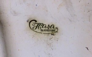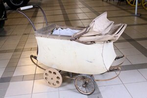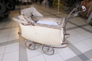 Dieser Kinderwagen wurde in den Jahren 1910/1920 hergestellt. Ein Firmenlogo mit dem Aufdruck „Hasa verchromt“ deutet auf den Hersteller hin. Leider konnten wir keine weiteren Informationen über die Firma herausfinden. Der Wagenkorpus besteht aus Holz und ist mit einem elfenbeinfarbenen Kunststoff bezogen. Das Verdeck ist stark verschmutzt, brüchig, hart und daher nicht mehr verstell- bzw. abnehmbar. Der Aufbau des Kinderwagens ist durch Lederriemen mit dem Chassis verbunden. Diese „Riemchenfederung“ sorgt für eine angenehme Fahrt. Die Speichenräder haben eine Gummibereifung. Interessant ist ein besonderes Detail. Der frühere Besitzer –aus welchem Grund auch immer- war gezwungen sich ein Not Rad zu bauen. Wie sich im Bild erkennen lässt, war es durchaus brauchbar.