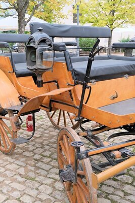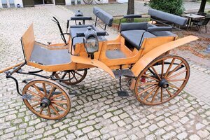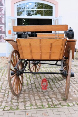Diese Pferdekutsche konnten wir aus der Sammlung „Kaurisch“ in Trier erwerben. Es ist eine Kutsche ohne Verdeck, die vier Personen Platz bietet. Die Bauform ist an den Typ „Jagdwagen“ angelehnt, besitzt aber weder eine Box für Hunde, noch eine Ablagefläche für erlegtes Wild. Der komplette Aufbau ist in Naturholz/lackiert gehalten. Der Wagen wurde als Selbstfahrer genutzt, was durch die gepolsterte Kutscherbank unterstrichen wird. Ebenso komfortabel gepolstert ist die Sitzbank im hinteren Teil der Kutsche. Rechts und links der Kutscherbank wurde die Beleuchtung angebaut. Es sind verzierte Petroleumlampen mit geschliffenen Gläsern. Ausgestattet ist das Gefährt mit einem modernen langen Handbremshebel mit eingebauter Arretierung. Die Bremse wirkt über ein Gestänge auf die hölzernen Bremsklötze, die direkt auf die Lauffläche der Hinterräder gepresst werden.