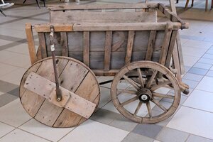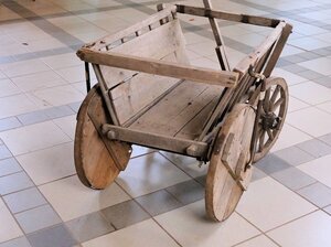 Auf den ersten Blick ist unser Objekt ein kleiner Handleiterwagen wie es viele gibt. Bei genauerer Betrachtung werden nicht nur die Spuren der Vergangenheit deutlich sichtbar, sondern auch wie man sich in Zeiten der Mangelwirtschaft zu helfen wusste. Die gebrochene Deichsel wurde geflickt, beide kaputten Hinterräder, die ursprünglich hölzerne Speichen hatten, wurden durch zusammengenagelten Kistenbretter ersetzt. Die eisernen Radreifen wurden wiederverwendet. So hat der kleine Leiterwagen die Zeit überstanden. Die Innenseite wurde vom letzten Besitzer mit Brettern ausgekleidet um Sand oder anderes Schüttgut zu transportieren.
