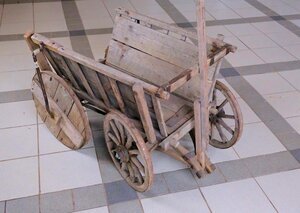 Auf den ersten Blick ist unser Objekt ein kleiner Handleiterwagen wie es viele gibt. Bei genauerer Betrachtung werden nicht nur die Spuren der Vergangenheit deutlich sichtbar, sondern auch wie man sich in Zeiten der Mangelwirtschaft zu helfen wusste. Die gebrochene Deichsel wurde geflickt, beide kaputten Hinterräder, die ursprünglich hölzerne Speichen hatten, wurden durch zusammengenagelten Kistenbretter ersetzt. Die eisernen Radreifen wurden wiederverwendet. So hat der kleine Leiterwagen die Zeit überstanden. Die Innenseite wurde vom letzten Besitzer mit Brettern ausgekleidet um Sand oder anderes Schüttgut zu transportieren.