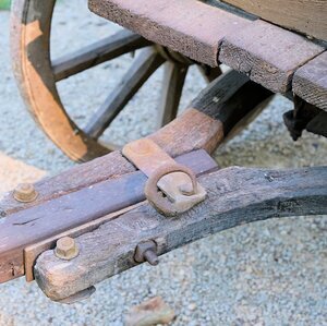 Unser Leiterwagen ist relativ groß und mit zwei Achsen ausgestattet. Die Vordere ist drehbar gelagert und mit Hilfe der Deichsel zu lenken. Während das Chassis noch Original ist, wurde der Aufbau erneuert. Die Seiten sowie Vorder- und Rückwand sind geschlossen, wodurch auch Schüttgut (Sand etc) transportiert werden konnte. Auf zwei kleine Besonderheiten wollen wir noch hinweisen. Zum einen lässt sich der Radstand verändern (s. Bild) zum anderen gibt es am Deichselansatz einen zusätzlichen Haken. Bei schwerer Last kann sich hier eine weitere Person einklinken und beim Ziehen unterstützen.