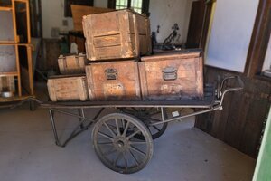 Einachsiger Handkarren mit zwei Schiebegriffen aus Metall. Genutzt wurden diese Karren für kurze Transportwege. Vielfach fanden sie an Bahnhöfen durch Gepäckträger Verwendung. Aber auch für den Transport von Stückgut, zwischen Gepäckwagen und Güterschuppen, war diese Karrenart ein wichtiges Hilfsmittel. Die Ladefläche selbst ist durch ein umlaufendes Metallrohr gegen Stoß geschützt. Ebenso die Ladung gegen das Verrutschen. Interessant ist noch ein anderes Detail. Ursprünglich wurde unser Objekt mit Metallreifen an den Speichen Rädern ausgeliefert. Später erhielten sie einen Überzug aus Vollgummi. Die Eisenreifen darunter sind noch sichtbar.