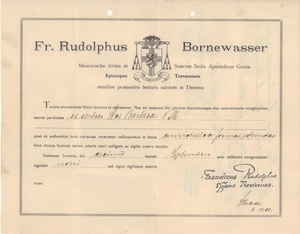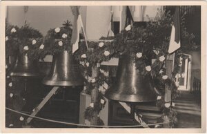 Die sieben Fotos in schwarz-weiß zeigen die Anlieferung und Segnung der drei neuen Glocken aus einer Brilloner Glockengießerei für die Pfarrkirche Bodendorf. Die ersten beiden Fotos zeigen die Anlieferung auf einem geschmückten Flachwagen. Das nächste Foto die vor der Kirche in einem Gestell aufgehangenen Glocken und die nächsten beiden Fotos die Schulklassen, die die glänzenden Glocken bewundern. Auf dem letzten Foto segnet Pfarrer Oskar Czecholinski die neuen Glocken, bevor sie in den Glockenturm hochgezogen und montiert werden. Pfarrer Oskar Czecholinski war der Pfarrer, der die Glocken zum Einschmelzen und zur Produktion von Kanonen im 2. Weltkrieg abliefern musste. Die entsprechende schriftliche Verfügung befinden sich in der Kirchenchronik.