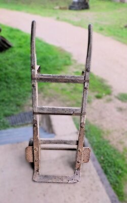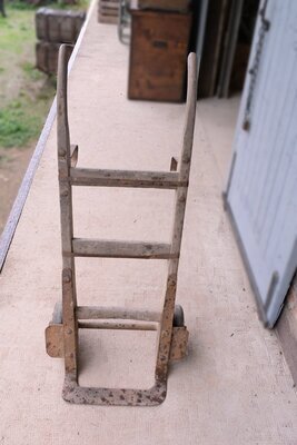 Die Sackkarre ist weitgehend aus Holz gefertigt. Aus Metall ist die Achse, die Stützen und der Bereich der Lastenaufnahme. Die hölzernen Querstreben sind gegen Stoß ebenfalls durche ein Metallband gesichert. Diese Art von Sackkarren waren weit verbreitet und nahezu in allen erdenklichen Bereichen zu finden. Die Räder haben eine Vollgummibereifung