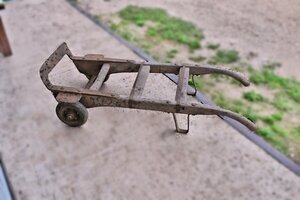 Die Sackkarre ist weitgehend aus Holz gefertigt. Aus Metall ist die Achse, die Stützen und der Bereich der Lastenaufnahme. Die hölzernen Querstreben sind gegen Stoß ebenfalls durche ein Metallband gesichert. Diese Art von Sackkarren waren weit verbreitet und nahezu in allen erdenklichen Bereichen zu finden. Die Räder haben eine Vollgummibereifung
