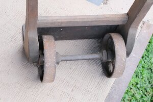 Eine kleinere Sackkarre. Griff, Auflagefläche und Querstreben (noch mit Holzdübel verbunden) sind aus Holz gefertigt. Die Auflagefläche für das Transportgut ist mit einer Metallabdeckung verstärkt. Die Räder, ebenfalls aus Metall, sind innliegend angebracht, was auf Kosten der Stabilität geht. Sackkarren waren weit verbreitet und nahezu in allen erdenklichen Bereichen zu finden.