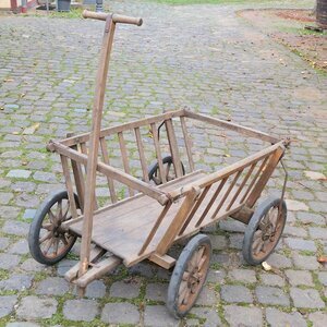 Aus der Landwirtschaft kennen wir den großen Leiterwagen, der von Pferden oder Kühen gezogen wurde. Um eine Art Miniaturausgabe handelt es sich bei unserem Handleiterwagen. Der Leiterwagen hat zwei Achsen, wobei die Vordere drehbar gelagert und mit der Deichsel verbunden ist. Die seitlichen Leitern begrenzen die Ladefläche. Die Räder (Speichenräder) von unseres Objekts haben eine Gummilauffläche, was den Wagen wesentlich leiser gegenüber den Metallreifen macht. Traurige Berühmtheit erlangte er während des 2. Krieges, wo viele ihr letztes Hab und Gut auf der Flucht, in solchen Leiterwagen transportierten. Auch nach dem Krieg blieb er ein wichtiges Transportmittel.