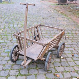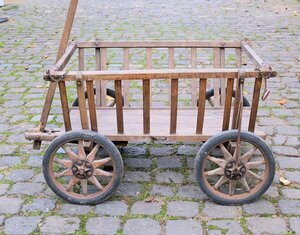 Aus der Landwirtschaft kennen wir den großen Leiterwagen, der von Pferden oder Kühen gezogen wurde. Um eine Art Miniaturausgabe handelt es sich bei unserem Handleiterwagen. Der Leiterwagen hat zwei Achsen, wobei die Vordere drehbar gelagert und mit der Deichsel verbunden ist. Die seitlichen Leitern begrenzen die Ladefläche. Die Räder (Speichenräder) von unseres Objekts haben eine Gummilauffläche, was den Wagen wesentlich leiser gegenüber den Metallreifen macht. Traurige Berühmtheit erlangte er während des 2. Krieges, wo viele ihr letztes Hab und Gut auf der Flucht, in solchen Leiterwagen transportierten. Auch nach dem Krieg blieb er ein wichtiges Transportmittel.