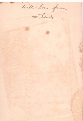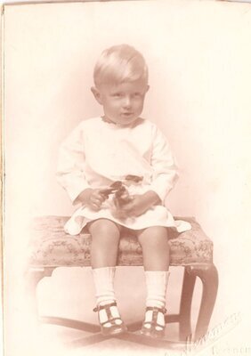 Zu sehen ist ein kleines Kind, das auf einer kleinen Bank im Fotoatelier sitzt. Das Kind ist ganz in Weiß gekleidet und hält ein Spielzeug? in den Händen. Das Foto wurde in der englischen Stadt Redditch aufgenommen und auf ein Stück Pappe geklebt. Auf der Rückseite steht handschriftlich With-love from ???