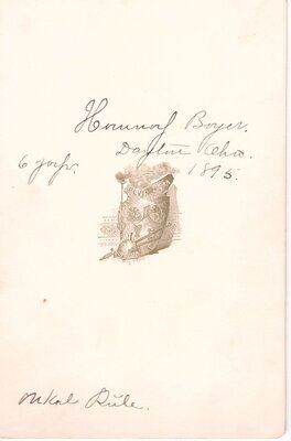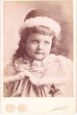 Zu sehen ist ein kleines Mädchen mit Zipfelmütze und winterlichem Umhang. Sie hat langes, lockiges Haar. Ihre Lippen sind geschlossen und sie schaut etwas verträumt am Fotografen vorbei. Das Foto ist auf einen Karton geklebt. Auf der Rückseite stehen nähere Angaben zu dem Kind. Es handelt sich um Hannah Bayer. Die Jahreszahl 1895 und 6 Jahr sind unter anderem Vermerkt.