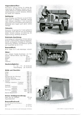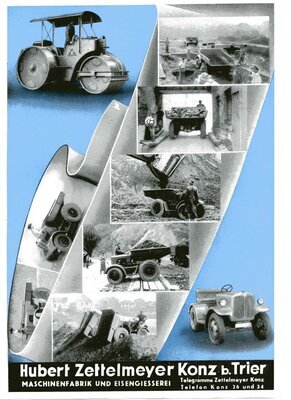 Ein Werbeblatt der Firma Zettelmeyer. Beworben wird der Autoschütter Typ K. Hierbei handelt es sich um einen sogenannten Vorderkipper, mit dem Schüttgut aller Art transportiert werden kann. Ein Vorderkipper ist ein Baustellenfahrzeug mit einer kippbaren Ladefläche für Bau- oder Aushubmaterial. Auf der Vorderseite des Prospektes befindet sich der Firmenname und das Firmenlogo. In einer größeren farbigen Aufnahme ist ein Baustellenfahrzeug mit einem Ladeflächenaufbau und in drei kleiner Aufnahmen je ein Muldenkipper sowie zwei Autoschütter im Arbeitseinsatz, zu erkennen. Auf den Seiten 2 und 3 werden der Fahrzeugaufbau des Autoschütters Typ K, die einzelnen Fahrzeugkomponenten, die Fahrzeugmaße und die Verbrauchsdaten beschreiben. Die Rückseite des Prospektes enthält Abbildungen zu verschiedenen praktischen Einsatzmöglichkeiten dieses Baustellenfahrzeuges. Zusätzlich sind im oberen linken Teil eine Straßenwalze und im unteren rechten Bereich ein Dieselschlepper abgebildet. Im Übrigen sind am Ende der 4. Seite die Firmenangaben abgedruckt. Der Prospekt wurde von dem in Trier ansässigen Industriegrafiker Erich Prinz erstellt.