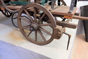 Bei unserem Objekt handelt es sich um einen umgebauten Leiterwagen, den ein findiger Winzer in eine Weinbergspritze umgebaut hat. Im Gegensatz zur Rückenspritze wurde bei dieser Konstruktion die Spritzbrühe aus einem ausgedienten Weinfass gepumpt. Zum Spritzen wurde der Schlauch von der Trommel (eine ehemalige amerikanische Kabeltrommel aus dem 2. Weltkrieg) abgerollt. Das Pumpen erfolgte mit einer Handpumpe, die ausgediente "Rückenspritze" diente als stationärer Druckbehälter. Das Spritzfass ist mit gespleißten Weidenbündeln gegen Erschütterungen gesichert. Wie bei vielen kleinen Winzerbetrieben erfolgte die Fortbewegung des Anhängers ausschließlich per Muskelkraft. Die Klotzbremse wirkt auf die Hinterräder.