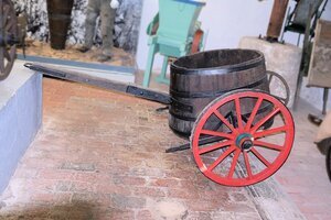Die Traubenbütte ist auf ein einachsiges Untergestell, mit eisenbereiften Speichenräder aus Holz, montiert. Sie diente einem Kleinwinzer zum Transport der abgeernteten Trauben. Über einen Hebelmechanismus konnte die Bütte auf dem Boden abgestellt und mit Trauben befüllt werden. Für den Abtransport wurde mit dem Hebelmechanismus die volle Bütte wieder angehoben und auf eigener Achse abtransportiert Die Deichsel ist so konstruiert, dass dies auch mit einem kleinen Weinbergsschlepper geschehen konnte.