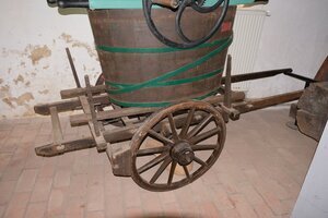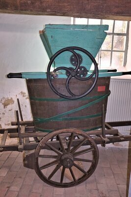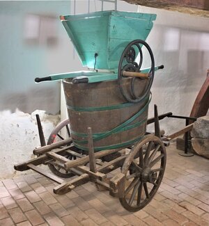 Diese einachsige Transportkarre stammt von einem Kleinwinzer und wurde speziell für die Traubenlese in dieser Art aufgebaut. Die hölzerne Bütte wurde für den Transport sicher auf der Karre befestigt. Karre samt Ablassgölte (Bütte) mussten per Muskelkraft zum Weinberg geschoben bzw. gezogen werden. Eine Klotzbremse wirkt direkt über eine Kurbel auf die Hinterräder und verhindert, dass bei Steigungen/Gefälle das Gefährtsich selbständig macht. Bei unserem Objekt ist eine Traubenmühle auf die Bütte aufgesetzt, wodurch die leere Bütte gleich mit der Maische gefüllt werden konnte.