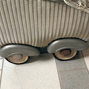 Der Puppenwagen aus Weidengeflecht stammt aus den 1950er Jahren. Das Innenteil ist aus Pappe und mit Kunststoff verkleidet. Der Griff ist ebenfalls mit Kunststoff bezogen. Am Fußende des Oberteils, ist eine Tasche mit Deckel eingearbeitet. Das Chassis, aus Metall, wird mit dem Oberteil durch die Riemchenfederung verbunden.Der Puppenwagen hat vier geschlossene, gummibereifte Räder mit Schutzblechen. Das Verdeck ist zurückklappbar.