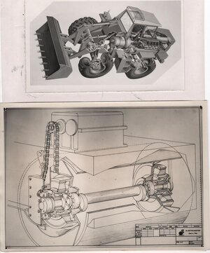 Es handelt sich um eine zweiseitige Druckvorlage, die insgesamt vier perspektivische Schnittzeichnungen enthält. Die Zeichnungen wurde von dem in Trier ansässigen Industriegrafiker Erich Prinz gefertigt. Auf der Vorderseite befinden sich zwei Zeichnungen eines sogenannten Autoschütters der Firma Zettelmeyer. In der oberen Zeichnung ist das gesamte Fahrzeug abgebildet. Die Kippmulde wurde dabei skizziert. Die untere Zeichnung bildet als Ausschnitt im wesentlichen den Motorblock und die Antriebsachse ab. Im oberen Teil der Rückseite befindet sich die perspektivische Schnittzeichnung eines Radlader. Im unteren Teil dieser Seite ist die Zeichnung einer Antriebsachse als perspektivische Schnittzeichnung angebracht.