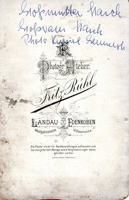 Eine Portrait Aufnahme im Cabinet Format (10 x 15 cm) von Christiana Louise Spitzfadem aus Albersweiler/Pfalz. Die Aufnahme wurde 1886, Christiana war 20Jahre alt, von dem Foto Atelier Fritz Rühl aus Landau gemacht. Louise trägt ein hochgeschlossenes, dunkles Kleid mit Stehkragen. Eine doppelreihige Perlenkette schmückt den Halsbereich. Christiana Louisa wurde am 31.März 1866 in Albersweiler geboren. Geheiratet hat Sie den Postadjutanten Carl Starck am 22. November 1890 in Ludwigshafen. (Siehe auch weitere Verlinkungen)