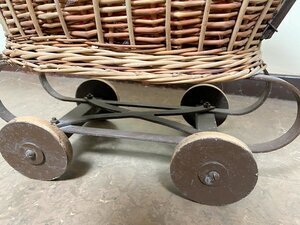 Ein ovaler Weidekorb wurde, in Eigenleistung, zum Puppenwagen umgebaut. Eine robusten Konstruktion aus Weidenstäben, wurde zum Gerüst des Wagenhimmels. Die Griffstange aus Metall wurde recht grob in das Korbgeflecht eingearbeitet. Das Untergestell, aus Eisen ist industriell hergestellt und stammt von einem älteren Puppenwagen. Die vier Holzräder sind ebenfalls in Eigenleistung gefertigt. Der Bezug für das Kopfteil fehlt, ansonsten ist der Wagen in einem ordentlichen Zustand.