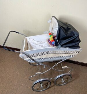 Ein Puppenwagen aus den 1960er Jahren. Das Oberteil, eine Holzkonstruktion, ist mit grauem Kunststoff bezogen. Die Seitenteile wurden durch ein schwarz-weißes Kunststoffgeflecht optisch aufgewertet. Das verstellbare Verdeck ist in schwarz gehalten, während der Innenbereich mit weißem Kunststoff ausgekleidet ist. Das Chassis ist zusammenklappbar und, wie die Speichenräder und Schutzbleche auch, verchromt. Die Riemchenfederung verbindet Chassis und Oberteil miteinander. Der rechte, vordere Lederriemen fehlt und wurde durch ein Stoffband provisorisch ersetzt.