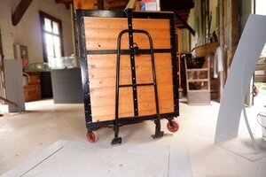 Dieser mittelgroße Transportbehälter der ehemaligen Reichsbahn, wurde in geschlossenen Güterwagen transportiert. Zum Befüllen lässt sich die vordere Wand abnehmen und der Deckel zur Hälfte öffnen. Die abklappbare Deichsel hat zwei Funktionen. Zum einen lässt sich der, mit vier Vollgummireifen ausgerüstete Wagen gut lenken, zum zweiten wird beim Hochklappen der Deichsel der ganze Wagen angehoben und so sicher geparkt. 2015 konnte unser Museum einige restaurierte Exemplare erwerben, die heute in unserem Güterschuppen bzw. in einen Wagon der Reichsbahn stehen.
