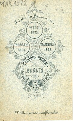 Die Vignettenaufnahme zeigt eine junge Frau mit dunklem Oberteil, welches im Brustbereich eine Knopfleiste hat,außerdem ist der Stehkragen reich verziert. Sie trägt eine lange Kette und blickt links an der Kamera vorbei.Die Haare sind locker nach oben gesteckt. Auf der Rückseite ist Eigenwerbung mit dem Logo"Theodor Prümm, Berlin 1890" zu erkennen, ebenso Preismedaillen- Wien 1873, Berlin 1865,Hamburg1868- und der Hinweis daß die Platten aufbewahrt werden.