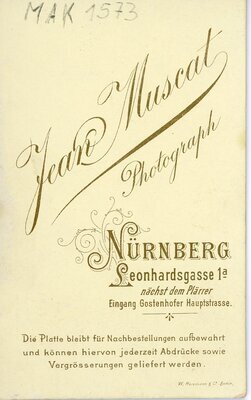 Das Bild ist eine Vignettenaufnahme auf der eine junge Frau mit hellem gemustertem Oberteil zu sehen ist. Das Oberteil hat einen Stehkragen mit Rüschenbesatz. Die junge Frau hat ihre gelockten Haare locker hochgesteckt. Des weiteren trägt sie Ohrringe, eine Brosche und eine lange dünne Kette.Ihr Blick geht nach links. Auf der Vorder-und Rückseite des Kartons ist die Eigenwerbung des Photographen Jean Muscat aus Nürnberg zusehen und der Hinweis daß die Platten aufbewahrt werden.