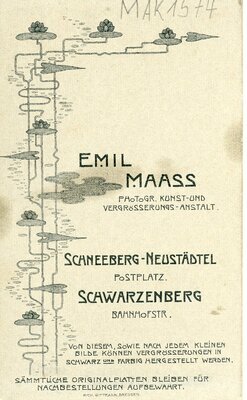 Die Vignettenaufnahme zeigt eine junge Dame mit hellem Oberteil ,welches einen großen Kragen und einen kleinen Ausschnitt hat. Um den Hals trägt sie ein breites verziertes Band mit einem kleinen Anhänger. Die dunklen Haare sind locker nach hinten zusammengesteckt.Ihr Blick geht nach links. Auf der Vorder- und Rückseite des Kartons ist die Eigenwerbung des Atelier Maas aus Schneeberg i/S. Außerdem der Hinweis daß Vergrößerungen in schwarz und farbig hergestellt werden können und daß die Platten aufbewahrt werden.