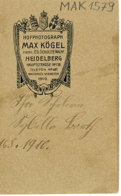 Das Portrait zeigt eine junge Dame mit einem sehr großen Hut mit Schleife.Sie trägt ein dunkles Oberteil mit langen Ärmeln und Stehkragen. Dekolletébereich und Ärmel sind in schmale und breite Längsbiesen gelegt und mit Stickerei verziert.Um den Hals trägt sie eine lange dünne helle Kette. Die Haare sind locker nach hinten frisiert. Leicht zur Seite gedreht schaut sie gerade in die Kamera. Die Aufnahme entstand beim Hofphotographen Max Kögel, der Firma Ed. Schultze Nachf., in Heidelberg. Auf der Rückseite befindet sich Eigenwerbung des Fotostudios sowie der Hinweis, daß der Nachdruck verboten ist. Ebenso auf der Rückseite ein handschriftlicher Vermerk " Ihre Schülerin Sybilla Worth, 16.5.1910" .