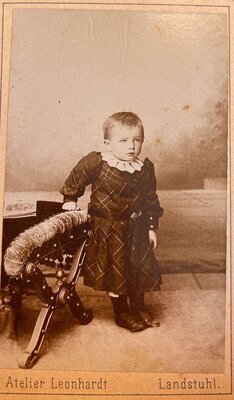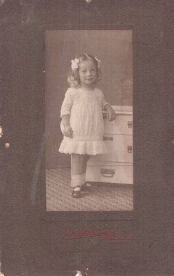 Zu sehen ist ein kleines Mädchen, welches auf einen Stuhl gestellt wurde. Es hält sich an der Lehne fest und schaut den Fotografen direkt an. Sie trägt ein weißes Kleid und dunkle Schuhe. Neben dem Mädchen ist ein großer Blumenkübel zu sehen. Über ihr ist ein Palmzweig zu erkennen.