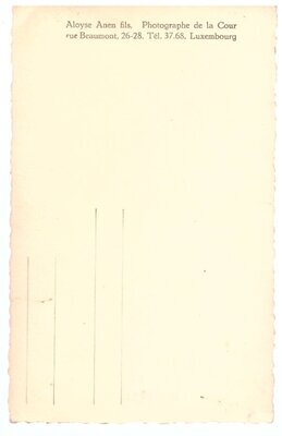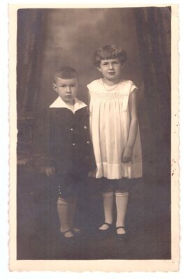 Zu sehen sind zwei Kinder, Junge und Mädchen. Sie stehen nebeneinander leicht zugewandt. Das Mädchen trägt ein etwa knielanges, weißes Kleid, weiße Kniestrümpfe und dunkle Schuhe. Der Junge trägt eine Anzugjacke mit großem, weißen Kragen und eine kurze Hose, sowie Kniestrümpfe.