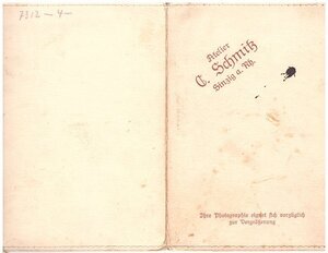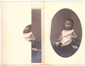 Zu sehen ist ein Kleinkind, welches im Fotoatelier sitzt. Es ist nur mit einem Hemdchen bekleidet. Die Haare sind kurz geschnitten. Es blickt den Fotografen direkt an. Die Aufnahme befindet sich, mit einer identischen, in einer kleinen Sammelmappe.