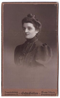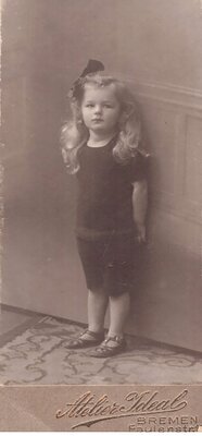 Zu sehen ist ein Mädchen im Alter von von ca. fünf Jahren. Sie ist dunkel gekleidet, und lehnt such mit dem Rücken an eine Wand. Sie trägt eine Kurze Hose und Sandalen. Das Haar ist lockig und schulterlang. Auf der rechten Seite des Kopfes ist eine Schleife zu sehen.