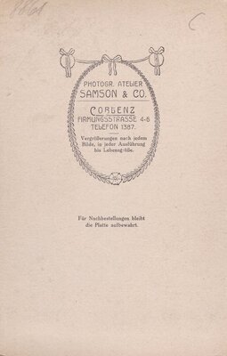 Zu sehen sind drei Kinder, zwei Jungen und ein Mädchen. Die Jungen haben das Mädchen in die Mitte genommen. Sie sitzt auf einem, mit Fell bedeckten, Hocker. In ihren Händen hält sie ein Buch, dessen linke Hälfte auch von einem anderen Kind gehalten wird. Alle drei blicken ernst in die Kamera. Der rechts stehende Junge trägt eine Jacke, an der eine Uhrkette befestigt ist. Das Foto ist auf ein Stück Pappe geklebt, auf dem unten der Name und der Sitz des Ateliers vermerkt sind.