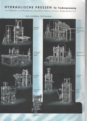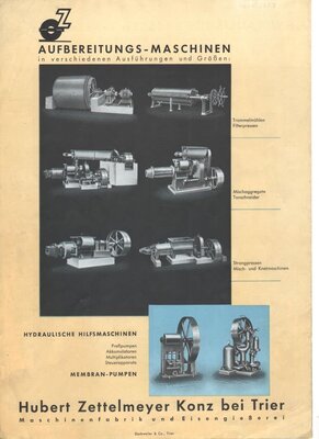 Es handelt sich um ein vierseitiges Faltblatt, dass verschiedene Keramikmaschinen zur Verarbeitung und Pressung von Baumaterial zeigt. Das Prospekt wurde von dem in Trier ansässigen Industriegrafiker Erich Prinz erstellt und in der Trierer Druckerei Dackweiler & Co. hergestellt. Neben einzelnen von Herrn Prinz gezeichneten Druckvorlagen befindet sich ein nahezu identisches weiteres und in der Trierer Druckerei J. Lintz gedrucktes Exemplar im Besitz des Freilichtmuseums Roscheider Hof. Das mehrfarbige Prospekt zeigt auf der Vorderseite als perspektivische Schnittzeichnung ein Mahlwerk (Kollergang) und eine Zweiplattenpresse. Seite zwei enthält sechs Zeichnungen unterschiedlicher Maschinen zur Naß- und Trockenmahlung. Die Seite drei beinhaltet neun unterschiedliche hydraulische Pressen zur Trockenpressung von Fußboden- und Wandplatten, feuerfesten Steinen, Klinkern, Klinkerplatten, usw.. Die Rückseite des Werbeprospektes zeigt unterschiedliche Maschinen zur Aufbereitung des Baumaterials und weist mit zwei Abbildungen auf weitere hydraulische Hilfsmaschinen und Membranpumpen hin.