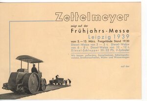 Es handelt sich um ein vierseitiges Faltblatt im Querformat. Die Broschüre wurde von dem in Trier ansässigen Industriegrafiker Erich Prinz anlässlich der in Berlin vom 17. Februar bis 05. März 1939 durchgeführten Internationalen Automobil-Ausstellung erstellt. Auf der ersten Seite ist eine Fotografie mit dem Zettelmeyer-Dieselschlepper Typ Z1 zu sehen, der einen mit Baumstämmen beladenen Anhänger zieht. Daneben befinden sich Angaben zur Dauer der Ausstellung und der Lage des Messestandes der Firma Zettelmeyer. Außerdem wird darauf hingewiesen, dass dort die Dieselschlepper Typ Z1 und Z2 mit verschiedenen Sonderausrüstungen gezeigt werden. Die beiden Innenseiten des Faltblattes enthalten Angaben zur Adresse des in Berlin-Charlottenburg befindlichen Verkausbüros und neben dem Firmenname sowie dem Firmenlogo auch perspektivische Darstellungen eines Dieselschleppers und zweier Dampfwalzen. Die Rückseite der Broschüre enthält die perspektivische Zeichnung einer Dampfwalze im Arbeitseinsatz. Daneben befinden sich Hinweise zu der vom 05. März bis 13. März 1939 in Leipzig stattfindenden Frühjahrsmesse sowie den dort ausgestellten Dieselwalzen und Dieselschlepper. Im Übrigen werden Angaben zu den ansonsten angebotenen Baumaschienen gemacht.