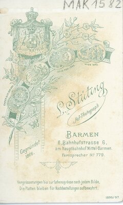 Die Vignettenaufnahme zeigt eine junge Frau oder ein Mädchen in einem hellen Oberteil, welches im Vorderteil und Armen in Falten gelegt ist. Der kleine Ausschnitt ist mit einer breiten Spitze verziert, außerdem hat das Oberteil Scheifen auf jeder Schulter.Die junge Frau trägt eine kurze 2-reihige Perlenkette um den Hals. Ihre hellen gelockten Haare sind nach hinten frisiert, leicht zur Seite gedreht schaut sie frontal in die Kamera. Auf der Rückseite befindet sich das Wappen des Hofphotographen L. Stüting aus Barmen sowie das Gründungsjahr 1866 und 4 nationale und internationale Auszeichnungen. Ebenso ein Vermerk auf Vergrößerungen und Nachbestellungen.
