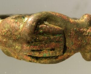 Der Ring wurde 1951 von F. Klimm im Holzsarg eines Bischofs in der Mitte des Langhauses gefunden. Der fast kreisrunde Ring ist an der Außenseite halbrund, an der Innenseite abgeflacht; nach der Oberseite hin verbreitert sich der Reif in Form von Ärmeln mit flachen Einschnürungen; aus den Ärmeln treten zwei rechte Hände - hervor, die sich so ineinander legen, dass die eine sich von oben mit den Fingern in die Handfläche der anderen legt, die ihre Unterseite nach oben gedreht hat. In den 1950er Jahren in Plexiglas eingelassen.