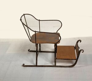 Ein Kinderschlitten, hergestellt in traditioneller Schmiedearbeit um 1900. Die Kufen sind am Anfang und am Ende schneckenartig nach oben eingedreht. Die Sitzfläche ist aus Holz und hat ringsum ein schmiedeeisernes Gitter zur Sicherheit des Kindes. Die Kinderfüße stehen auf einer Plattform, ebenfalls aus Holz (erneuert).