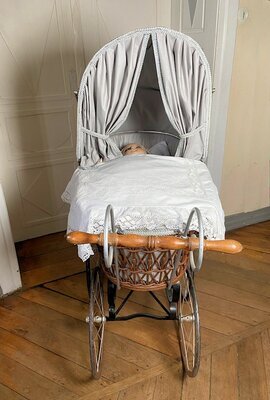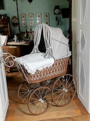 Ein Schmuckstück ist dieser sehr elegante, braun lackierte Korb-Stubenwagenwagen, etwa aus dem Jahre 1880. Das verstellbare Stoffverdeck, mit einem eingefassten Spitzenvolant kann bei Bedarf geschlossen werden. Der Wagen hat ein Metallchassis, dass über eine aufwändig gearbeitete Federung mit dem Korb verbunden ist. Die Metallspeicherräder haben vorn und hinten unterschiedliche Größen, die sich in der Mitte um einige cm überlappen.
