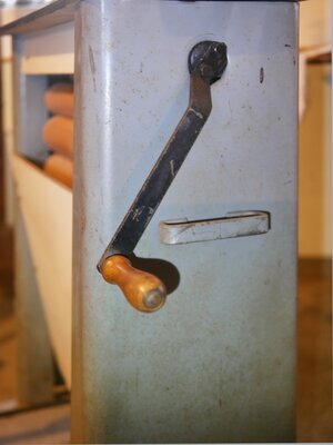 Wäschemangel mit 3 Walzen und Kurbel. Wahrscheinlich "Marke Eigenbau". Im Vergleich zu den anderen Museumsstücken sehr einfach Konstruktion. Die Wäschestücke wurden zwischen den Walzen, die über eine Handkurbel mittels Übersetzungen mit mehrere Zahnrädern angetrieben wurden, durchgepresst und verloren dadurch etwa die Hälfte des in diesen nach dem Waschvorgang vorhandenen Wassers, was die Trockenzeit erheblich reduzierte. Die Maschine konnte auch (als Mangel) zum Glätten der Wäsche verwendet werden.