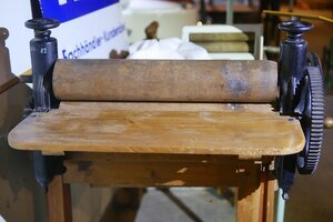 Wäschemangel aus Gusseisen mit Holzwalzen und Brettern. Die Wäschestücke wurden zwischen den 2 Walzen, die über eine Handkurbel mittels Übersetzungen mit mehrere Zahnrädern angetrieben wurden, durchgepresst und verloren dadurch etwa die Hälfte des in diesen nach dem Waschvorgang vorhandenen Wassers, was die Trockenzeit erheblich reduzierte. Je ein Brett auf beiden Seiten ermöglichte es die Wäsche durch mehrmaliges Vor- und Rückwärtsdrehen der Kurbel zu glätten. Die Maschine besitzt keine Federn. Der Druck der oberen auf die untere Walze läßt sich mittels von zwei Stellschrauben regulieren.Mechanik aus Gusseisen. Keine Herstellerangabe.