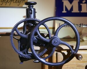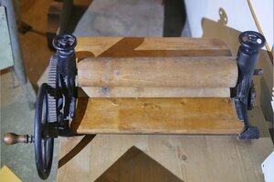Wäschemangel aus Gusseisen mit Holzwalzen und Brettern. Die Wäschestücke wurden zwischen den 2 Walzen, die über eine Handkurbel mittels Übersetzungen mit mehrere Zahnrädern angetrieben wurden, durchgepresst und verloren dadurch etwa die Hälfte des in diesen nach dem Waschvorgang vorhandenen Wassers, was die Trockenzeit erheblich reduzierte. Je ein Brett auf beiden Seiten ermöglichte es die Wäsche durch mehrmaliges Vor- und Rückwärtsdrehen der Kurbel zu glätten. Die Maschine besitzt keine Federn. Der Druck der oberen auf die untere Walze läßt sich mittels von zwei Stellschrauben regulieren.Mechanik aus Gusseisen. Keine Herstellerangabe.