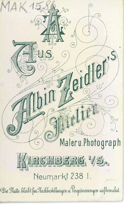 Die Fotografie entstand in einem Studio als Vignettenaufnahme. Es zeigt eine junge Frau mit rundem Gesicht und leicht gewellten Haaren, die streng nach hinten gekämmt sind. Sie trägt ein dunkles Oberteil mit leicht angedeuteten Puffarmen und einem spitzen Ausschnitt ,dessen Rand mit mehreren Spitzentechniken verziert ist. Darunter ist ein heller gemusterter Einsatz mit hohem Stehkragen zu sehen. Als Schmuck trägt sie kleine Ohrhänger. Die Fotografie entstand im Atelier Albin Zeidler in Kirchberg in Sachsen. Auf der Rückseite ist Eigenwerbung des Ateliers und der Hinweis auf Nachbestellungen und Vergrößerungen.