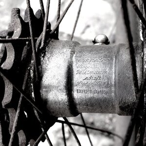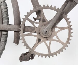 Ein seltenes Stück aus der Zeit der Mangelwirtschaft. Das betraf auch Ersatzteile für Fahrräder, ins besondere Schläuche und Mäntel. Der ehemalige Besitzer wusste sich zu helfen. Aus alten KFZ Radialreifen mit Stoffeinlage wurden passgenaue Teile ausgestanzt, (siehe Abb.) die sich unter den Wulst der Felge klemmen ließen. So entstand ein Notreifen aus Vollgummi. Bald wurde der Notbehelf nicht mehr gebraucht und das Rad rostete Jahrzehnte vor sich hin, bis es in unser Museum kam. In dem gleichen Zustand ist es heute noch.